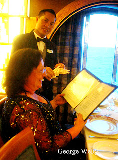 I hope you ate before you viewed this post. One thing people that have been on a cruise mention is the food. They were right. The food was good and always available. What they don't talk about is the dining room and service. The dining room was a great room and I enjoyed showing the room and the reflection in the silverware and glasses. Now the service, it was fabulous. Our headwaiter, 1 Gusti and his assistant, Alfred made dinner an experience and was one of the highlights of the cruise. They learned our names on the first night and called us by name, even through they saw us once a day. They sang and danced during dinner. Laura and Shirley would jump up and get down with the staff dancing and Wayne took part one night. 1 Gusti was funny and fed Paula one night, which was very funny and another night showed us how to make a doll out of a napkin. I know we were one table of 12 but they made us feel special. The food was also great. There was one item on the menu called something you would not eat at home or something like that. I had eaten each of the items at home, but one, frog legs. Now I can say I ate frog legs and they were so good. They reminded me of escargot that I had the night before and many times before the trip. Even the food on the buffet was good and I was able to eat healthy food like fruit. There was tea time in the afternoon which was perfect for us, as we are tea drinkers. We had a great time on the cruise and the dinner experience and food was a large part of that on the Carnival Pride.